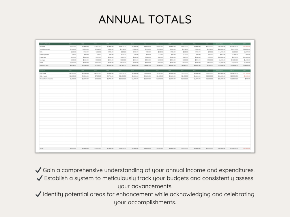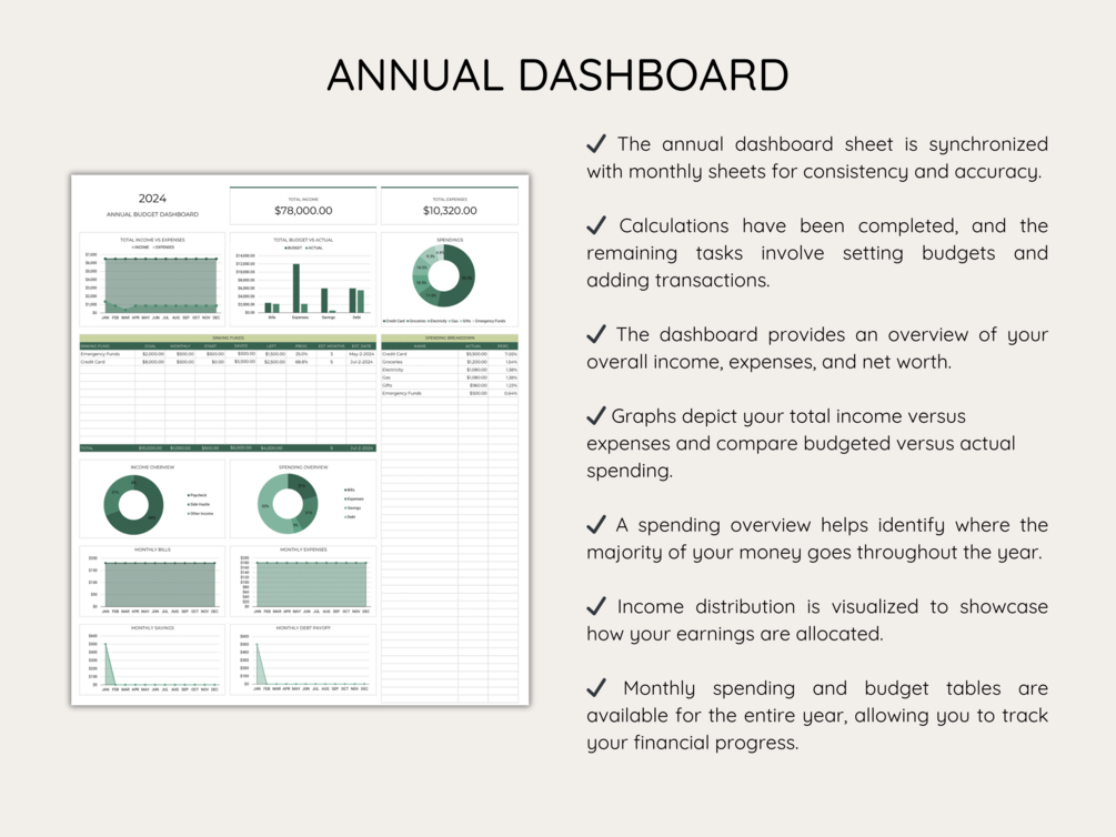 • 𝐌𝐨𝐧𝐭𝐡𝐥𝐲 𝐏𝐥𝐚𝐧𝐧𝐞𝐫 𝐒𝐡𝐞𝐞𝐭𝐬: Immerse yourself in thorough monthly planning with 12 dedicated sheets, one for each month. Strategize income, forecast expenses and monitor your progress throughout the year.