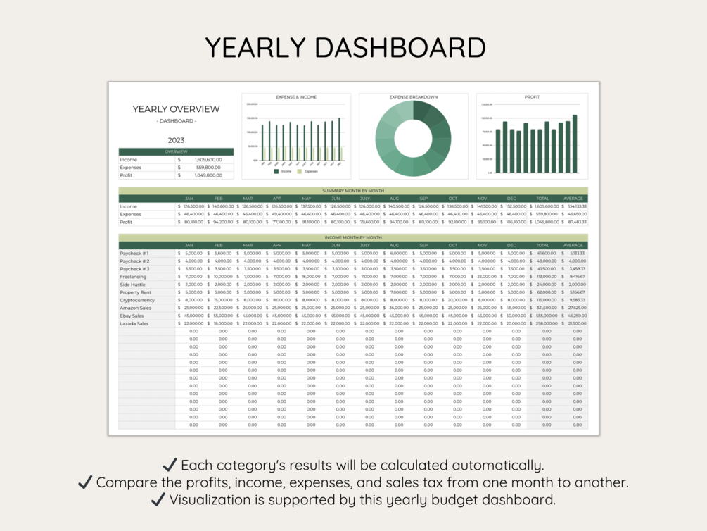 โ€ข ๐Œ๐จ๐ง๐ญ๐ก๐ฅ๐ฒ ๐Ž๐ฏ๐ž๐ซ๐ฏ๐ข๐ž๐ฐ: Dive into the finer details of your finances month by month with our small business bookkeeping spreadsheet. Track up to 40 income and expense categories, allowing you to stay on top of your financial progress, set monthly goals and make informed financial decisions throughout the year.