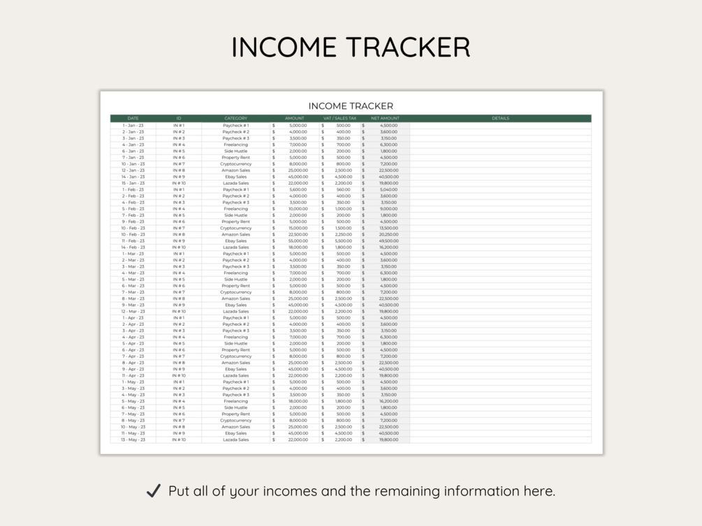 โ€ข ๐ˆ๐ง๐œ๐จ๐ฆ๐ž ๐“๐ซ๐š๐œ๐ค๐ž๐ซ: Effortlessly manage your diverse income sources with our Income Tracker sheet within the Bookkeeping Spreadsheet Template. Record and categorize up to 40 different income streams, ensuring a clear and organized financial picture. This data feeds directly into the Monthly and Yearly Dashboards, providing you with insightful visualizations to guide your financial journey.