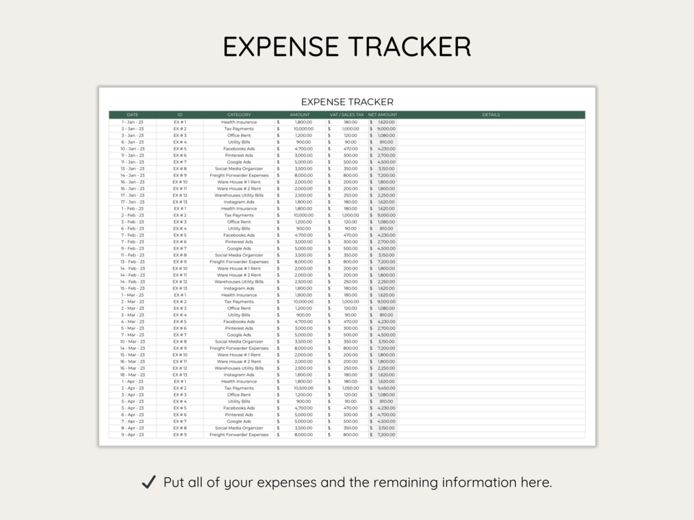 โ€ข ๐„๐ฑ๐ฉ๐ž๐ง๐ฌ๐ž ๐“๐ซ๐š๐œ๐ค๐ž๐ซ: Simplify expense tracking and control with our Expense Tracker sheet in the Bookkeeping Spreadsheet Template. Easily log expenditures across various categories, allowing you to stay on top of your financial commitments. The data you enter here fuels the Monthly and Yearly Dashboards, offering visual representations that empower you to make informed financial decisions.